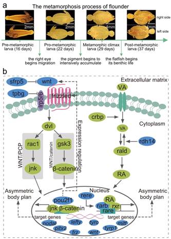 图2:鲽形目鱼类扁平体型及其可能的形成机制。a:鲽形目鱼类具有扁平的体型结构;b:鲽形目鱼类扁平体型可能的形成机制。
